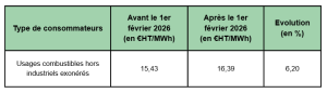 - Surcoût : +0,49 €TTC/MWh PCS en 2026.
